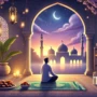 DALL·E 2025-03-04 09.54.54 - An illustration of a peaceful Ramadan setting. A person sits on a prayer mat, appearing refreshed and energized after fasting. In the background, a be