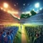 India vs Pakistan cricket match scene — stadium full of emotional fans, Pakistani supporters holding