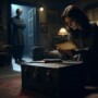 A suspenseful scene inside an old Pakistani house at night. A young woman in her 20s looks at a dust