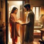 (Anaya appears from her room, adjusting her dupatta, and looks at the money order in his hand.)